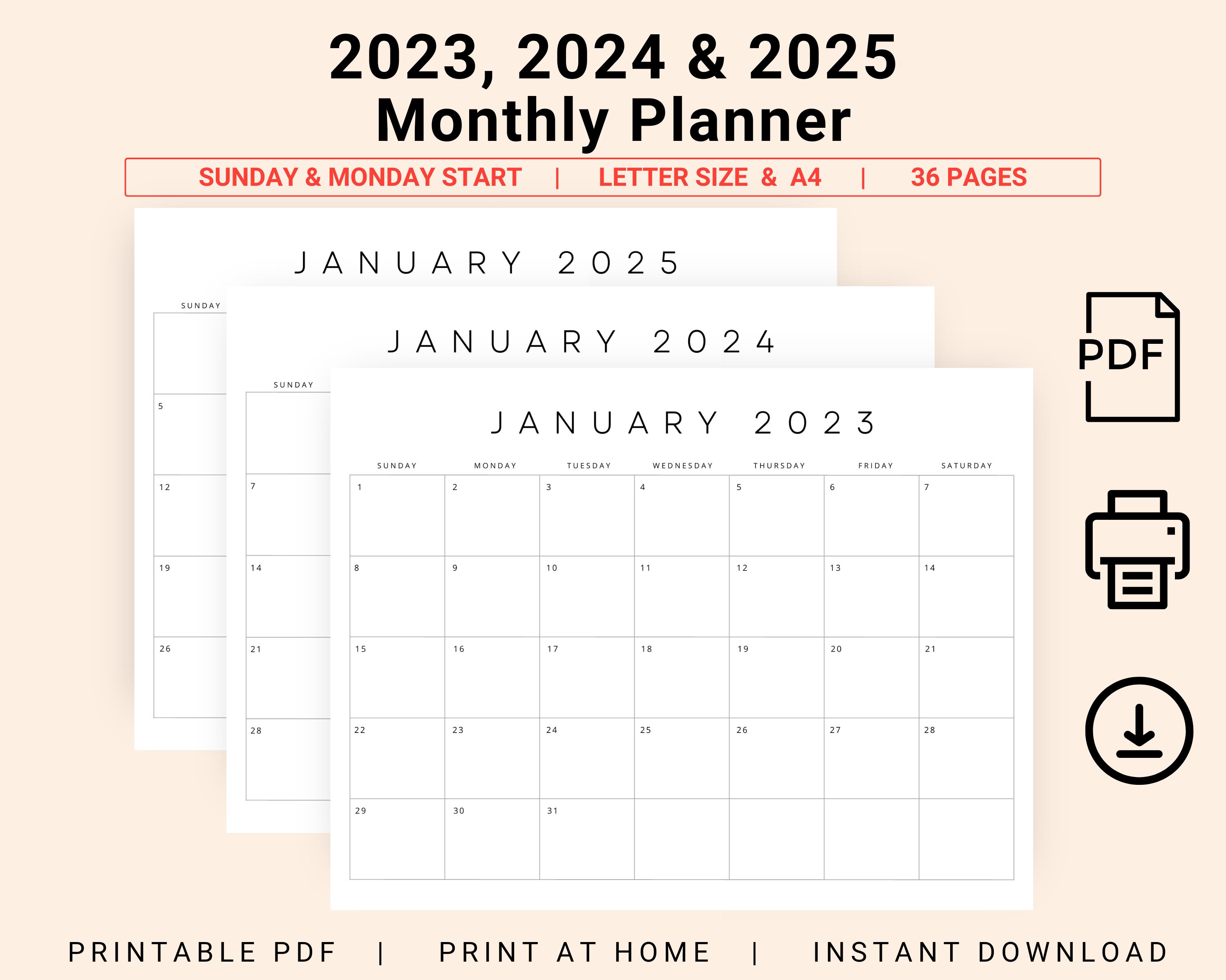 2023 2024 2025 Monthly Planner Printable 3 Years Monthly Etsy